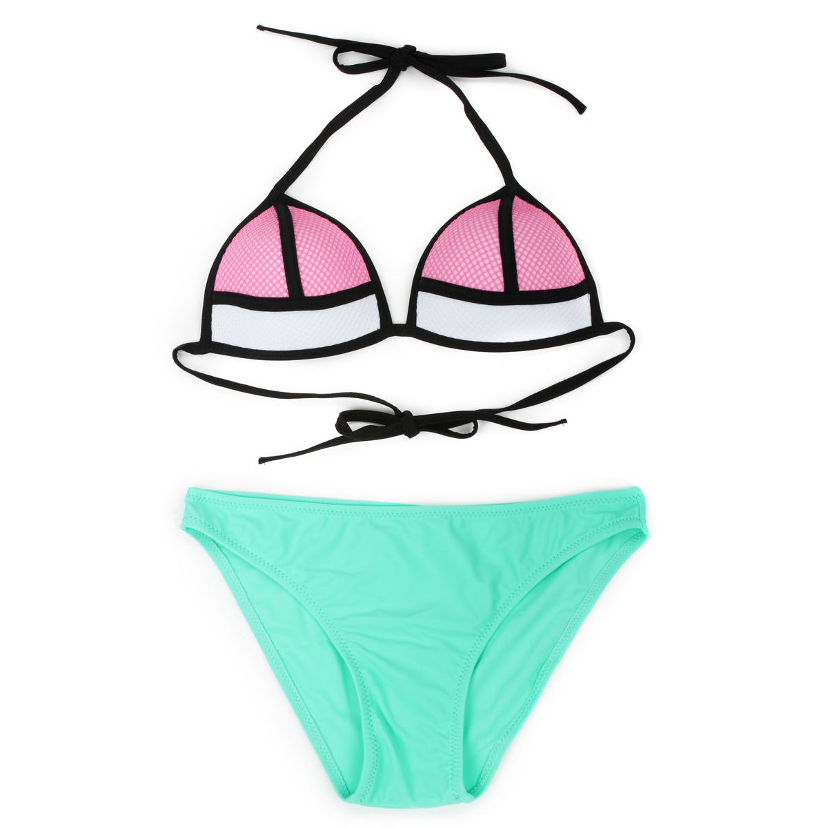 海丽泳衣厂-粉+绿拼接网纱三角杯【新款泳衣,欢迎订制】